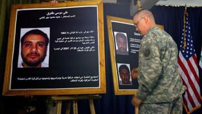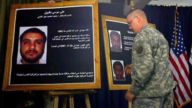 جندي امريكي يعرض صورة لموسى دقدوق اثناء مؤتمر صحفي في المنطقة الخضراء