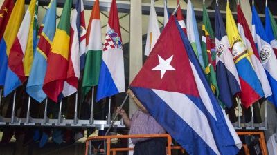 وقد وضع العلم الكوبي الذي ثبته موظفون في ساعات الصباح الاولى، بين علمي كرواتيا وقبرص.