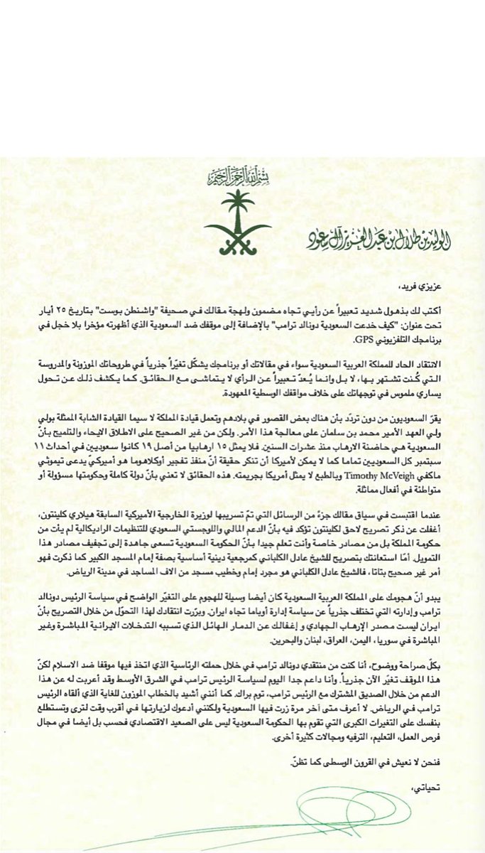 وتابع، في رده على الصحفي فريد زكريا الذي كتب مقالا قبل أسبوع في صحيفة "واشنطن بوست" بعنوان "كيف خدعت السعودية دونالد ترامب": "إن هذه الحقائق لا تعني أن دولة بكاملها وحكومتها مسؤولة أو متواطئة في أفعال مماثلة".
