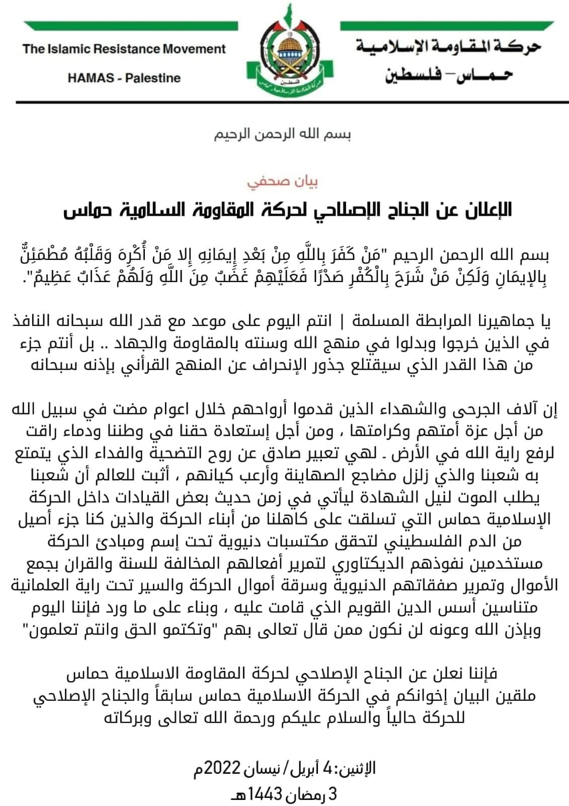 تداول رواد مواقع التواصل الاجتماعي ومجموعات فلسطينية على تطبيق الواتس اب بيان لمجموعة اعلنت انشقاقها عن حركة حماس التي تسيطر على غزة وحملت اسم التيار الاصلاحي في حماس