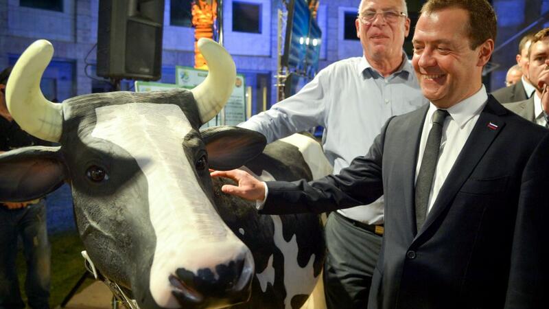 وزير الزراعة الاسرائيلي اوري اريئيل (يسار) ورئيس الحكومة الروسية ديمتري مدفيديف خلال زيارة الاخير إلى إسرائيل