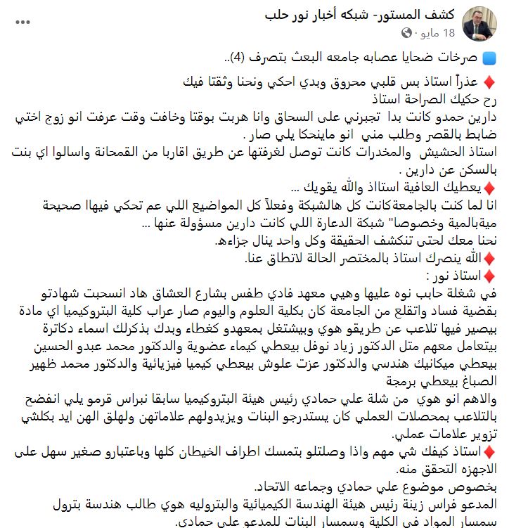 كانت فضائح اخرى وسلوكات مشينة قد ظهرت من طرف بعض المتنفذين في الجامعات السورية، مستغلين حاجة الطالبات للتخرج ومحاولة الذهاب الى سوق العمل لمساعدة عائلاتهم