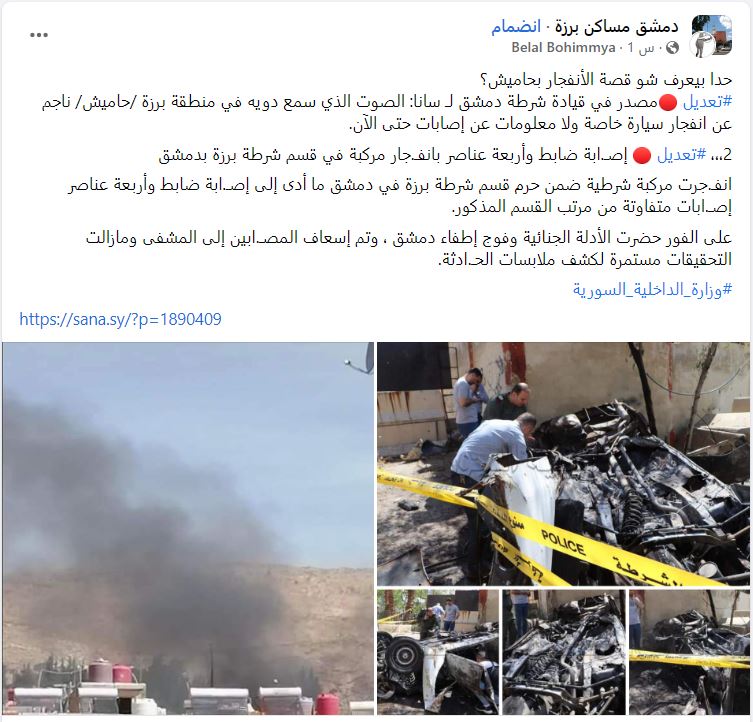 وقالت الشرطة في دمشق ان الانفجار استهدف قسم الامن في منطقة برزة والسيارة التي انفجرت تتبع للقسم واوضحت "ان مركبة شرطية انفجرت صباح اليوم ضمن حرم قسم شرطة برزة في دمشق، ما أدى إلى إصابة ضابط وأربعة عناصر إصابات متفاوتة"