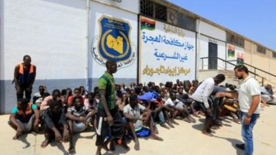 مجموعة من المهاجرين الافارقة غير الشرعيين امام مركز جهاز مكافحة الهجرة غير الشرعية في تاجوراء قرب طرابلس