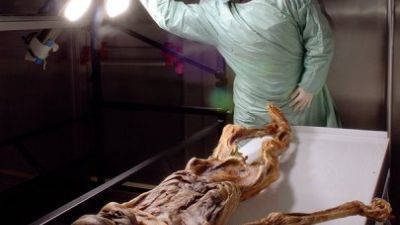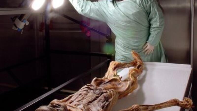 صورة لرجل الجليد "اوتزي" خلال معاينته في المتحف