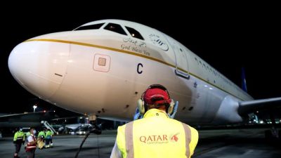 وصول الطائرة التابعة لشركة "الخطوط الجوية العربية السعودية‎" إلى مطار حمد في الدوحة