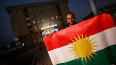 يحمل العلم الكردي امام مقر برلمان كردستان العراق في اربيل