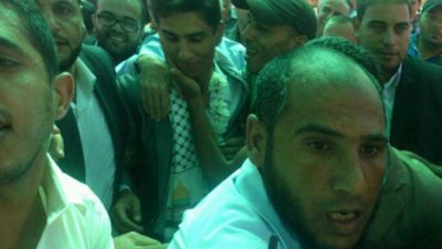 وعلى بوابه المعبر الخارجية تجمع عشرات الاف الفلسطينيين وهم يحملون صورا لمحمد عساف كتب عليها "مبروك يا ابن فلسطين" الى جانب اعلام فلسطين ورايات حركة فتح الصفراء.