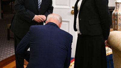 تظهر الصورة الملتقطة في البيت الابيض بايدن وهو يجثو على ركبتيه أمام المسؤولة التي تنتمي لطائفة يهودية متشددة.