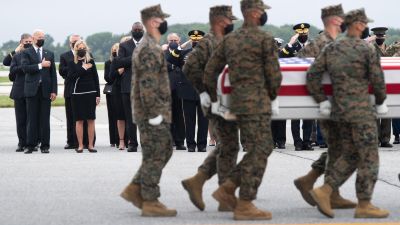 استقبل الرئيس الأميركي جو بايدن الأحد، جثامين 13 عسكريا أميركيا قتلوا بتفجير مطار كابول الخميس، فيما اتهمت طالبان القوات الأميركية بقتلت مدنيين في المطار إثر حالة هلع أصابتها بسبب التفجير.