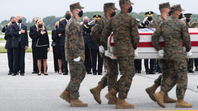 ووصل بايدن ترافقه قرينته جيل إلى قاعدة دوفر الجوية التي نقل إليها جوا من أفغانستان جثث العسكريين ضحايا الهجوم الذي أودى بأرواح نحو 200 شخص.