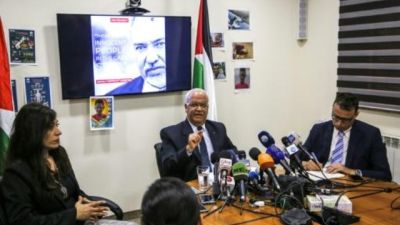 امين سر اللجنة التنفيذية لمنظمة التحرير الفلسطينية صائب عريقات يتحدث الى الصحافيين خلال مؤتمر صحافي في رام الله