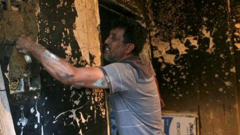وينتشل الناس ما يمكن انتشاله من بين أنقاض المنازل المدمرة. ويساعدهم الأطفال في أعمال التنظيف.