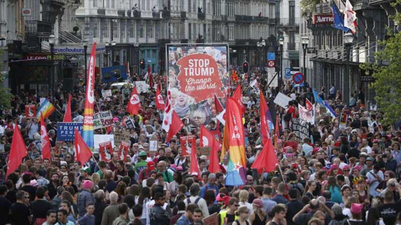 شهدت العاصمة البلجيكية بروكسل مظاهرة احتجاجية ضد الرئيس الأمريكي دونالد ترامب، تزامنًا مع قدوم الأخير إلى المدينة التي وصفها خلال حملاته الانتخابية بـ”حفرة جهنم”.