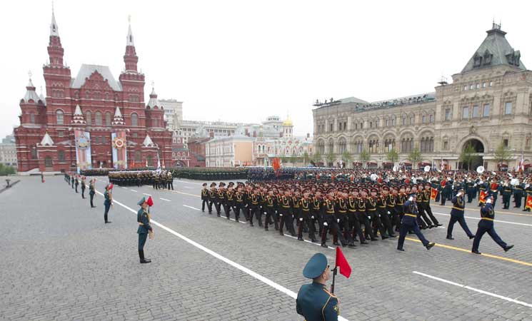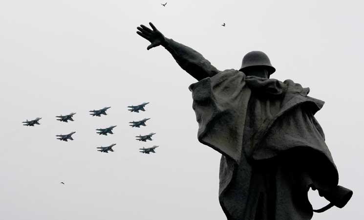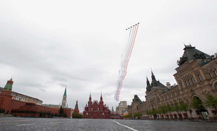 ولم يتم الاحتفاظ من العرض العسكري التقليدي في يوم النصر في 9 أيار/ مايو سوى بالعرض الجوي، فحلقت عشرات المقاتلات وطائرات الاستطلاع والتموين والمروحيات فوق موسكو.