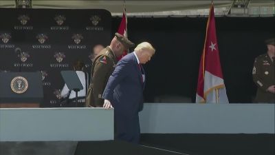 رد ترامب في تويتر على التساؤلات عن وضعه الصحي بعد مشهد هبوطه بخطوات غير ثابتة لممر في قاعدة وبست بوينت العسكرية، بقوله إن الممر "طويل جدا وحاد، وليس له سور جانبي، والأهم أنه كان زلقا جدا"،