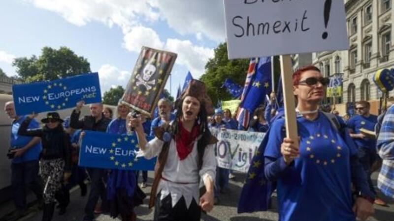 شارك آلاف الاشخاص في تظاهرة ضد خروج بريطانيا من الاتحاد الاوروبي في وسط لندن السبت، داعين الحكومة الى "اعادة النظر في بريكست ورفضه".