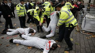 اضطرت الشرطة الى التدخل من اجل احتواء المتظاهرين في 10 داونينغ ستريت، بوسط لندن، حيث استقبل رئيس الوزراء دايفيد كاميرون الرئيس المصري عند الظهر.