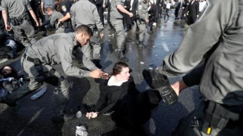 عناصر من الشرطة الاسرائيلية يحاولون ابعاد يهودي من المتدينين من احد شوارع القدس خلال تظاهرة ضد الخدمة العسكرية الالزامية