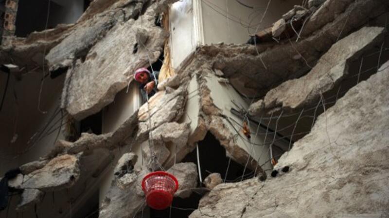 سوري ينقل بسلة بلاستيكية اغراضا من بيته المدمر بفعل القصف الجوي في حلب/أ.ف.ب