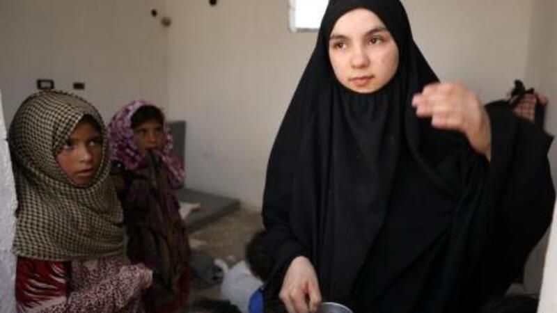 نور الهدى زوجة مقاتل سابق في تنظيم الدولة الاسلامية داخل مخيم للنازحين في عين عيسى شمالي الرقة