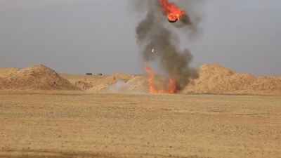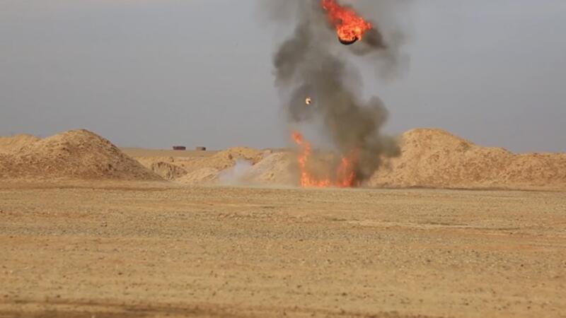 وقام عناصر تنظيم الدولة بتفكيك القنابل العنقودية، ووضعها داخل إطارات سُكب عليها مادة البنزين، قبل أن يفجّرها بعد إضرام النار فيها.