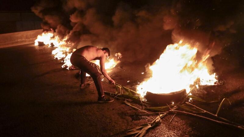 متظاهر لبناني مناهض للحكومة يحرق إطارات لسد الطريق السريع الساحلي شمال العاصمة بيروت