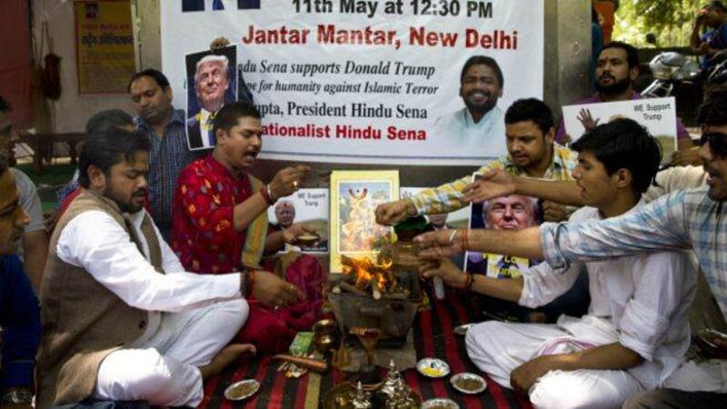 أوقد عشرات من أعضاء جماعة هندوسية يمينية النار في طقس ديني وهم يهتفون مغنين الأربعاء سائلين آلهتهم مساعدة ترامب في الفوز برئاسة الولايات المتحدة الأمريكية، بسبب معاداته للمسلمين ومطالبته بمنع دخولهم أمريكا.