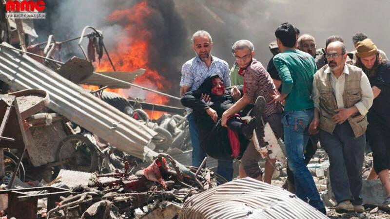 وقال موقع بلدي نيوز السوري ان طيران النظام الحربي ارتكب مجزرة راح ضحيتها العشرات من المدنيين بين شهيد وجريح، اليوم الثلاثاء، جراء استهداف السوق الرئيسي في المدينة.