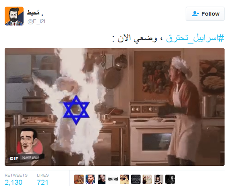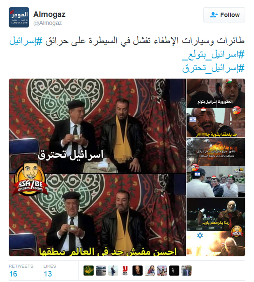 وجاء في تعليق احدهم "على جميع جيران اسرائيل العرب مساعدتها- اقترح ان يرسلوا طائرات مملوءة بالبنزين ويمطروها على المناطق المحترقة، اود استنشاق رائحة شواء الصهاينة".