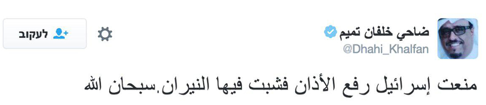 وعربيا، كتب الفريق ضاحي خلفان، نائب القائد العام لشرطة دبي في حسابه على تويتر "منعت اسرائيل رفع الاذان فشبت فيها النيران. سبحان الله".