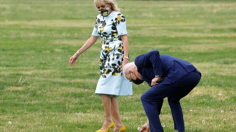 ووثق مقطع فيديو لمغادرة جو وجيل بايدن البيت الأبيض لحظة انحناء الرئيس خلال توجههما إلى المروحية رقم واحد ليقطف زهرة هندباء ويقدمها لزوجته التي قبلت هذه الهدية.