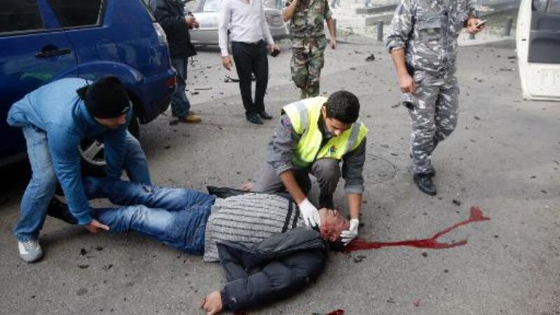 عناصر الصليب الاحمر اللبناني يحاولون اسعاف احد جرحى التفجير الذي اودى بحياة الوزير السابق محمد شطد في بيروت الجمعة
