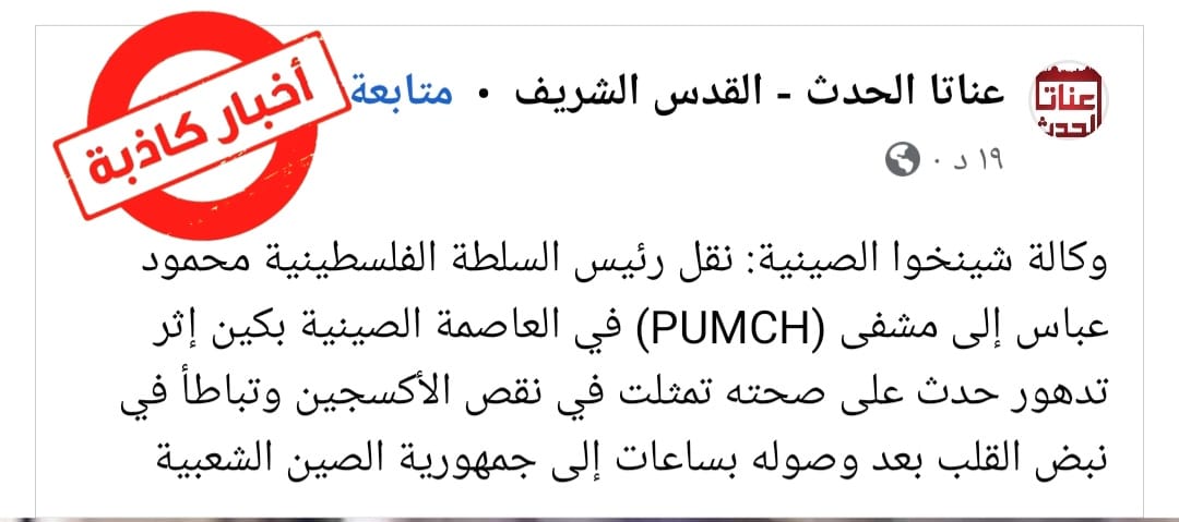 تحدث مغردون نقلا عما وصفوها بتقارير اعلامية صينية عن اصابة الرئيس الفلسطيني محمود عباس بأزمة صحية خلال زيارته الى الصين ونقله بشكل عاجل الى احد مشفيات العاصمة بكين