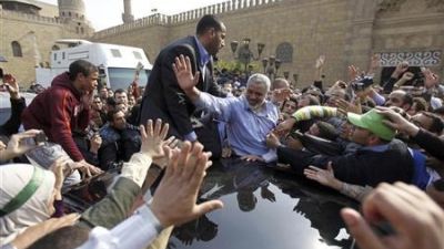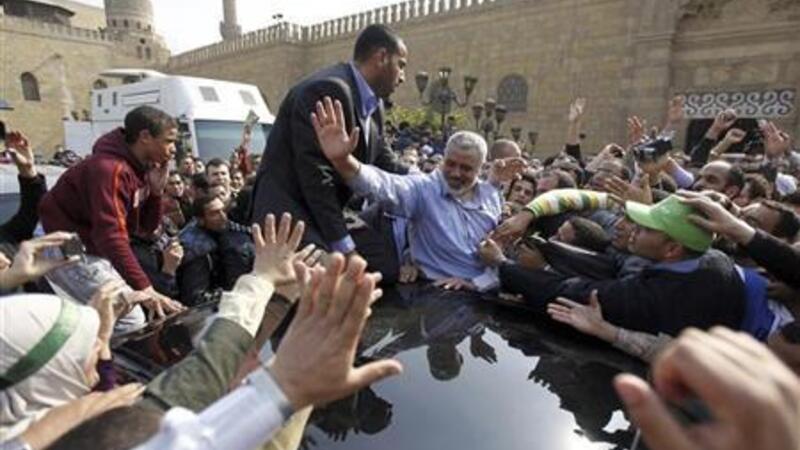 اسماعيل هنية يحيي انصاره عقب خطبته في الجامع الازهر بالقاهر