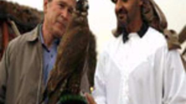 وبعد أقل من ساعة على خطابه الناري ضد إيران، اختبر بوش إلى حياة البساطة في صحراء أبوظبي، بدعوة من ولي عهد أبوظبي الشيخ محمد بن زايد آل نهيان، وحضور نائب الرئيس ورئيس مجلس الوزراء الشيخ محمد بن راشد آل مكتوم.