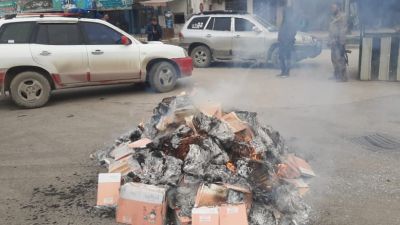 واظهر تسجيل فيديو عناصر من الشرطة العسكرية في مدينة جرابلس وهم يجمعون عشرات النسخ من الكتب ويقومون باحراقها في احد شوارع المدينة.