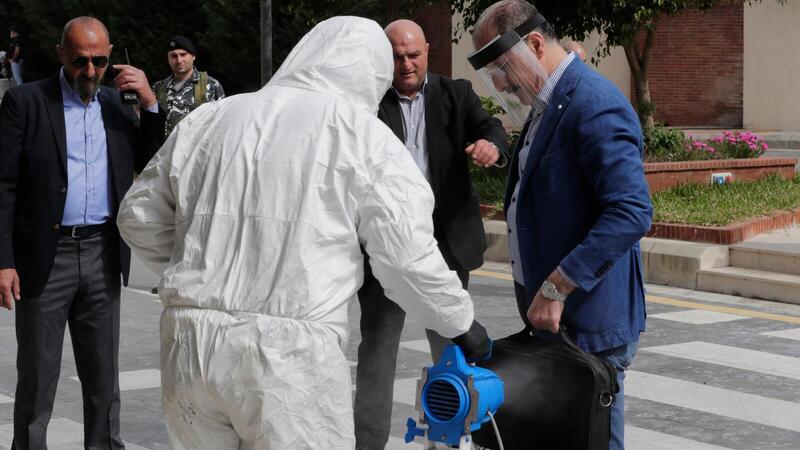 استُقبل أعضاء البرلمان اللبناني برش المطهرات لدى وصولهم لحضور جلسة برلمانية يوم الثلاثاء تغير مكان إقامتها من مقر البرلمان إلى مسرح للسماح بمسافات التباعد الاجتماعي بين الحاضرين للحد من تفشي فيروس كورونا المستجد.