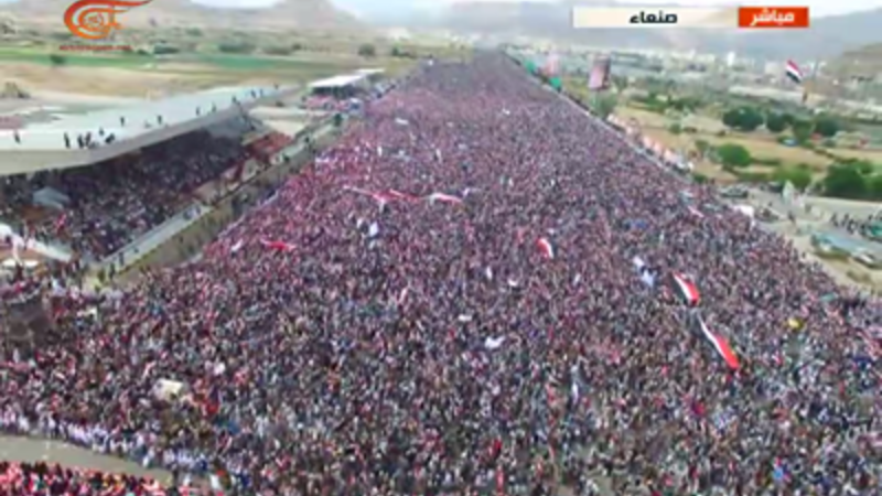 احتشد مئات آلاف اليمنيين وسط العاصمة صنعاء اليوم الأحد رفضاً لحرب التحالف السعودي على اليمن في ذكراها الثانية وجاءت الفعالية تحت عنوان "الصمود في مواجهة العدوان".