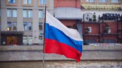 موسكو، روسيا – 6 يونيو 2025: علم روسيا على خلفية مبنى قديم يحمل كتابة "موسكو" باللغة الروسية.