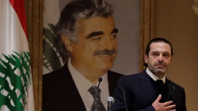 صورة رئيس الوزراء اللبناني الأسبق رفيق الحريري معلقة على الحائط ويقف من أمامها نجله سعد الحريري