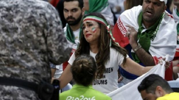 طلب طاقم تأمين أحد الملاعب في المجمع الأولمبي في ريو من ناشطة إيرانية أن تطوي لافتة احتجاجية رفعتها أثناء مباراة للكرة الطائرة وأن تغادر المدرجات.