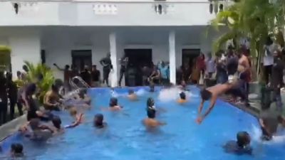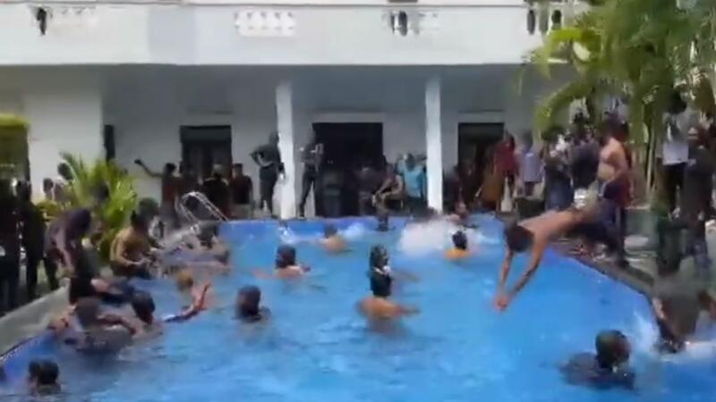 أظهرت مقاطع فيديو مجموعة من المتظاهرين السريلانكيين يلهون في غرفة نوم ومسبح رئيسهم غوتابايا راجابكسا، والذي كان قد لاذ بالفرار قبيل اقتحامهم المقر الرئاسي في وقت سابق السبت.