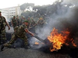 جنود لبنانيون يخمدون حريقا في اطارات اشعلها محتجونعلى انقطاع التيار الكهربائي في بيرون امس، الجمعة/أ.ف.ب