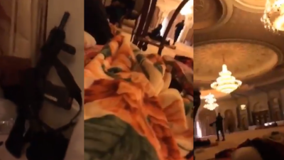 ونشر نشطاء في مواقع التواصل الاجتماعي مقطع فيديو يعتقد أنه لبهو الفندق، وفيه أشخاص يرقدون على فرش وحراس مسلحون وراءهم.