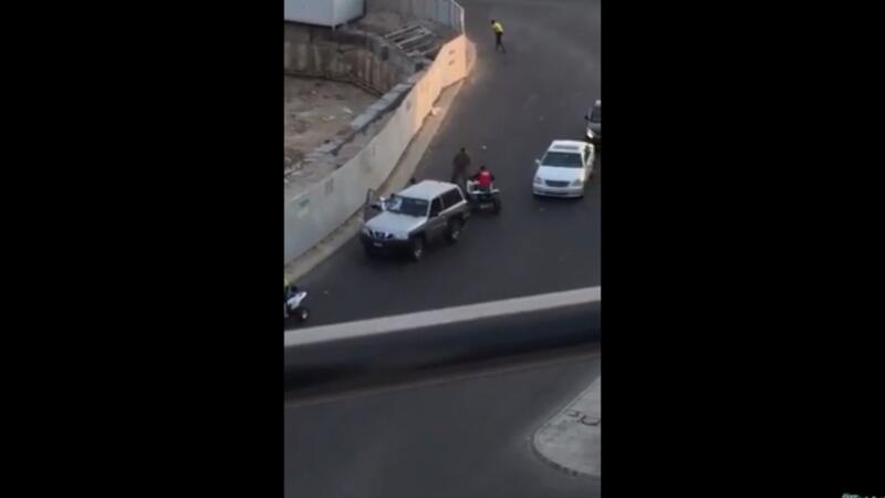ويظهر الفيديو شبان يدهسون شرطي بدراجة نارية، بعد الاعتداء عليه بشكل جماعي، في أحد أحياء مدينة جدة، غربي السعودية.