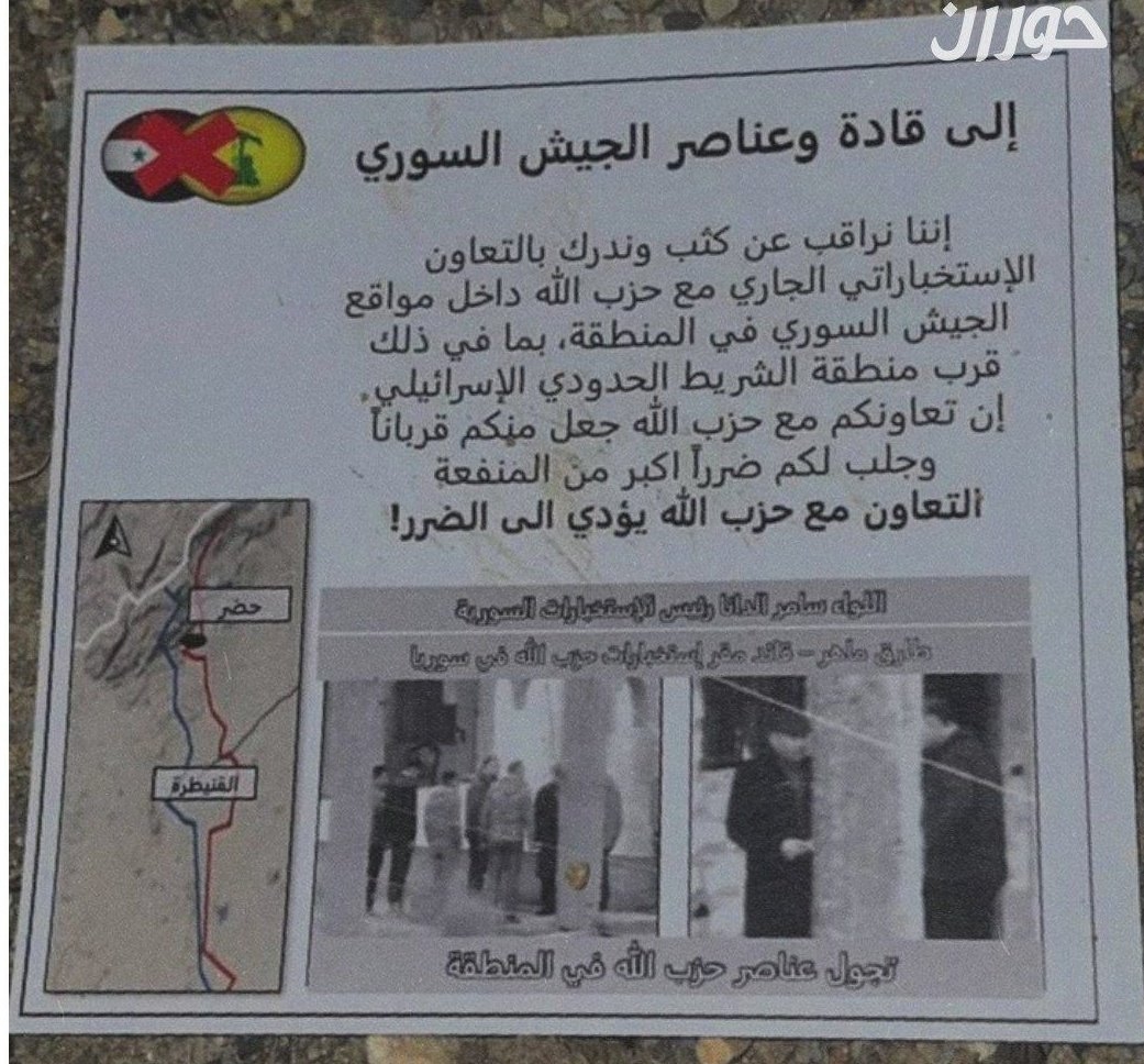 والقت طائرات اسرائيلية منشورات موجهة الى الجيش السوري قالت فيها "اننا نراقب وندرك التعاون الاستخباراتي الجاري مع حزب الله .. على الشريط الحدودي ... ان التعاون مع حزب الله جعل منكم قربانا وجلب لكم ضررا اكبر من المنفعة"