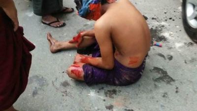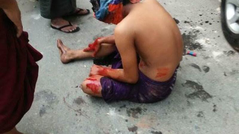 ويظهر فى الصور أحد المسلمين وهو جالس غارقا في دمائه نتيجة الجروح الموجودة في جسده.