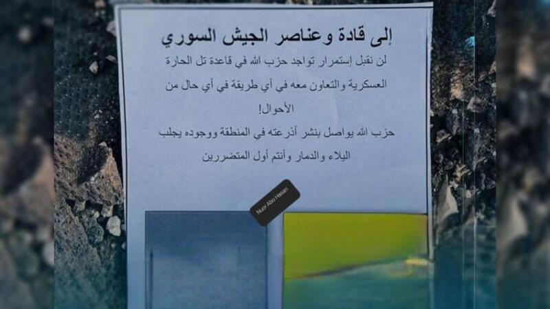 ووفق المنشور فانه موجه الى قوات الجيش العربي السوري النظامي وقالت فيه  “لن نقبل استمرار تواجد حزب الله في قاعدة تل الحارة العسكرية والتعاون معه في أي طريقة في أي حالة من الأحوال”.