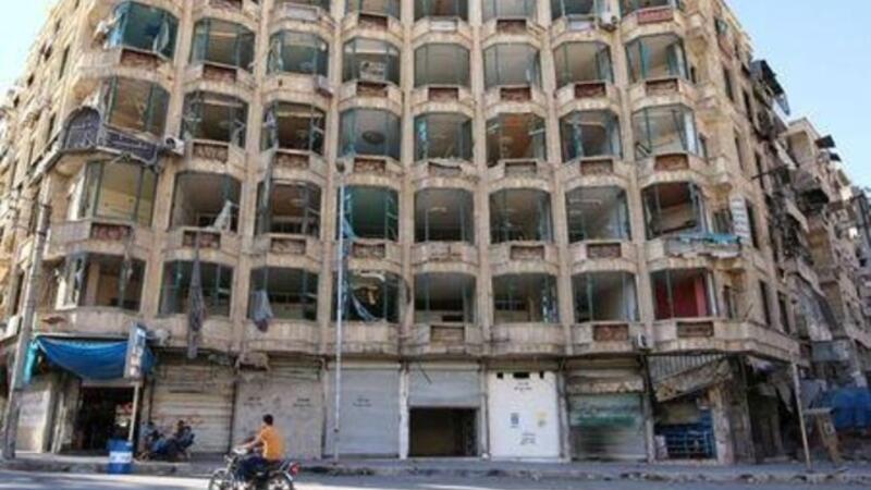 رجل يستقل دراجة نارية بجوار مبنى تعرضت واجهته لدمار في حلب